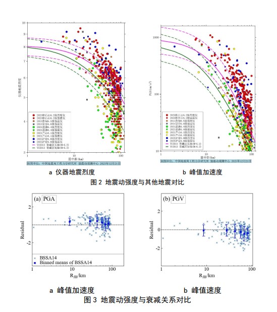 對(duì)比分析了此次地震的地震動(dòng)參數(shù)(儀器地震烈度、峰值加速度PGA和峰值速度PGV)與我國2015版地震動(dòng)參數(shù)區(qū)劃圖地震動(dòng)衰減關(guān)系的估計(jì)值、2022年四川瀘定6.8級(jí)地震、2021年云南漾濞6.4級(jí)地震的地震動(dòng)參數(shù)差別(見圖2)。整體上,儀器地震烈度和峰值加速度明顯高于2015版地震動(dòng)參數(shù)區(qū)劃圖中地震動(dòng)衰減關(guān)系的估計(jì)值;此次地震的地震動(dòng)與震級(jí)更大的瀘定6.8級(jí)地震的地震動(dòng)較為接近,明顯大于漾濞6.4級(jí)地震的地震動(dòng)。對(duì)比地震動(dòng)參數(shù)與美國NGA-West 2 衰減關(guān)系(見圖3),峰值加速度高于NGA-West 2衰減關(guān)系中位值,峰值速度與衰減關(guān)系中位值較為接近,表明此次地震地震動(dòng)的高頻能量顯著。