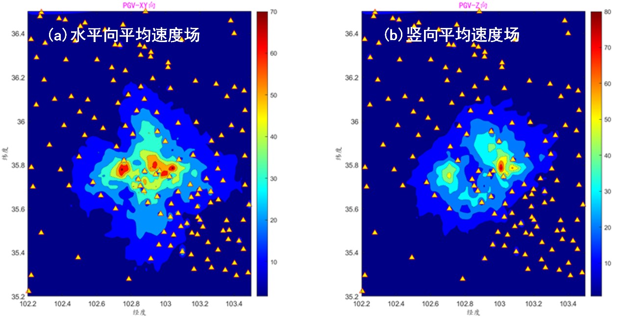 進(jìn)一步,我們結(jié)合震源反演初步結(jié)果,采用USTClitho2.0公共波速結(jié)構(gòu)模型(見圖5)和確定性地震動(dòng)模擬技術(shù),初步再現(xiàn)地震動(dòng)場(chǎng)的時(shí)空發(fā)育過程。我們采用了歷史統(tǒng)計(jì)得到的破裂時(shí)間過程函數(shù),同時(shí)考慮了此次地震應(yīng)力降高的特性。圖6給出了模擬的水平向和豎向峰值速度空間分布。從模擬結(jié)果可以看出,盡管沒有考慮地表土體對(duì)地面運(yùn)動(dòng)速度的放大作用,模擬值偏低,但模擬結(jié)果與烈度儀實(shí)測(cè)峰值速度場(chǎng)大致吻合。為此,進(jìn)一步確定了發(fā)震震源的高應(yīng)力降是造成此次地震記錄高異常峰值普遍存在的主要原因。