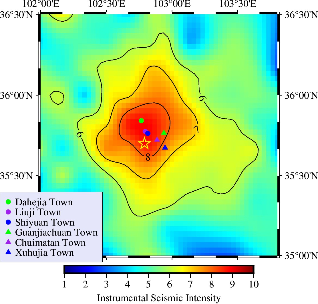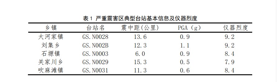 根據(jù)現(xiàn)場(chǎng)調(diào)查情況,大河家鎮(zhèn)、劉集鄉(xiāng)、石塬鎮(zhèn)、關(guān)家川鄉(xiāng)、吹麻灘鎮(zhèn)等鄉(xiāng)鎮(zhèn)震害嚴(yán)重。對(duì)此,我們對(duì)以上鄉(xiāng)鎮(zhèn)附近的強(qiáng)震動(dòng)記錄進(jìn)行了分析。首先,由儀器烈度分布圖(如圖7)可知,上述鄉(xiāng)鎮(zhèn)均位于高儀器地震烈度區(qū)(見表1)。