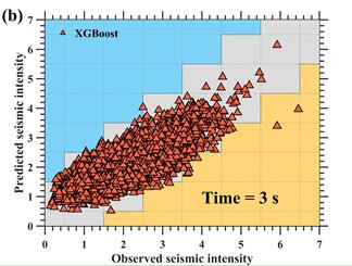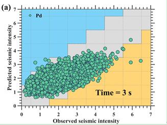 圖1 3秒時間窗下的預測值和觀測到的地震烈度的比較,時間表示時間窗的大小?;疑珔^域是正確的預測值,藍色區域是高估的預測值,黃色區域是低估的預測值。綠點表示(a)Pd模型,紅三角表示(b)xgBoost模型。