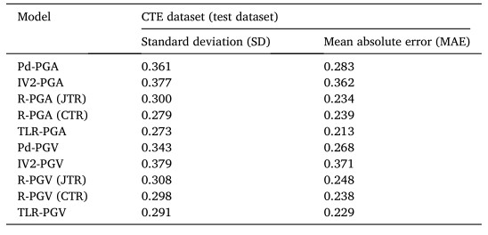 (3)對(duì)于相同的中國(guó)測(cè)試數(shù)據(jù)集,在P波到達(dá)后3秒,表1展示了基于TLR-PGA模型、TLR-PGV模型和基線(xiàn)模型的預(yù)測(cè)結(jié)果。從表1中可以發(fā)現(xiàn):和傳統(tǒng)PGA和PGV預(yù)測(cè)方法以及未使用遷移學(xué)習(xí)的神經(jīng)網(wǎng)絡(luò)模型,基于TLR-PGA模型和TLR-PGV模型可以獲得誤差更小的PGA和PGV預(yù)測(cè)結(jié)果。這也說(shuō)明:本文提出基于循環(huán)神經(jīng)網(wǎng)絡(luò)和遷移學(xué)習(xí)方法對(duì)于中國(guó)儀器烈度預(yù)測(cè)是可行的。